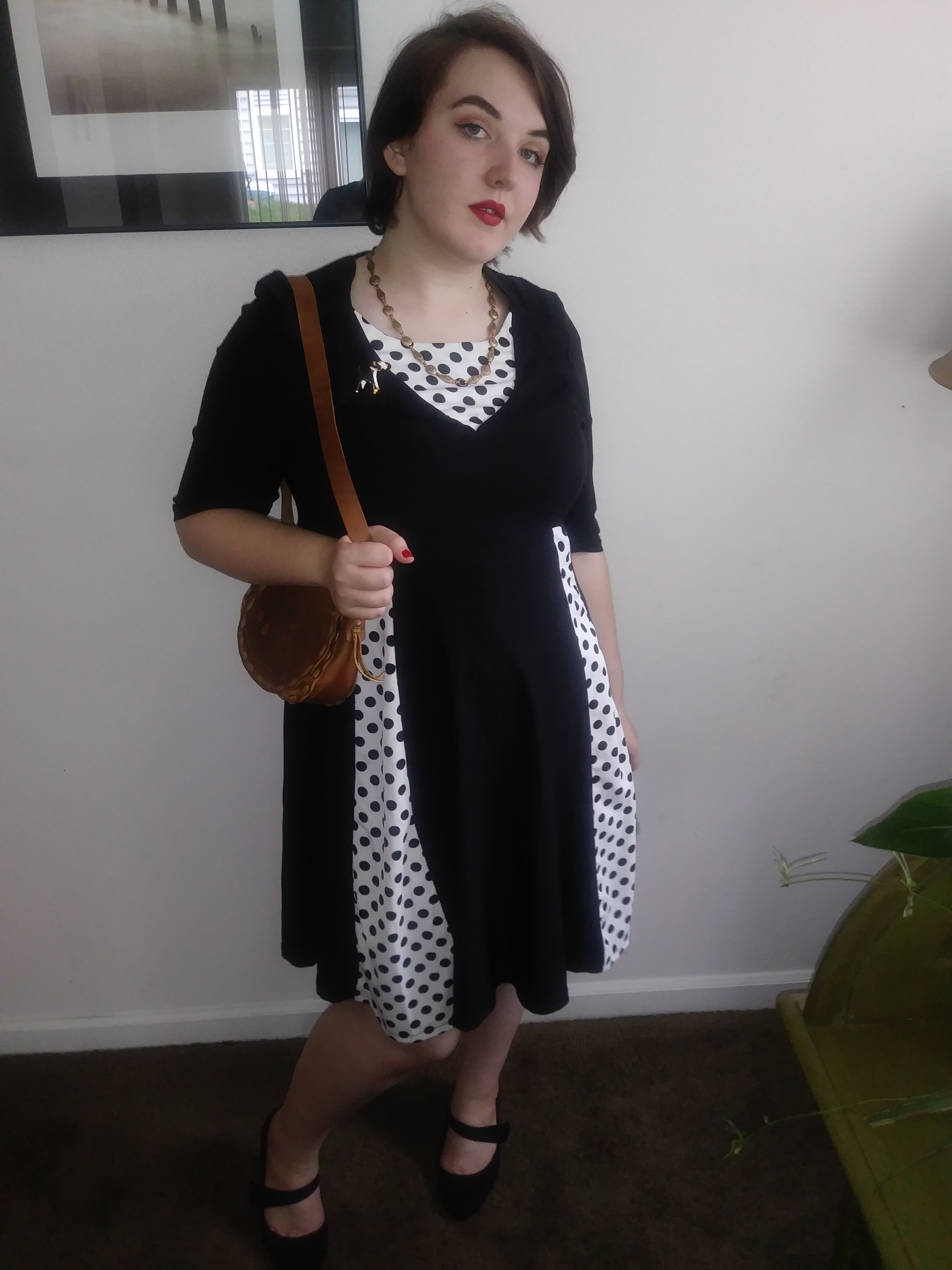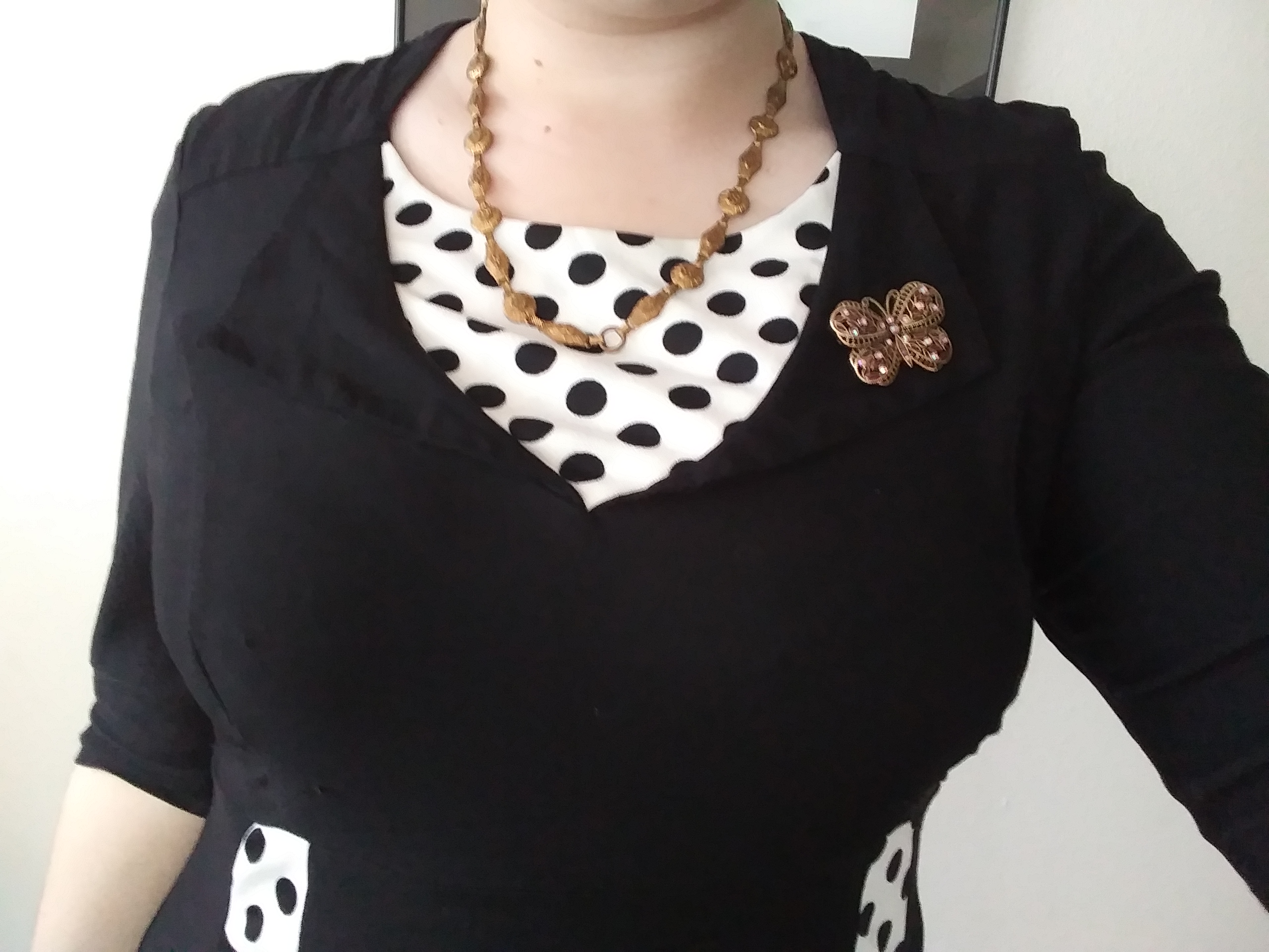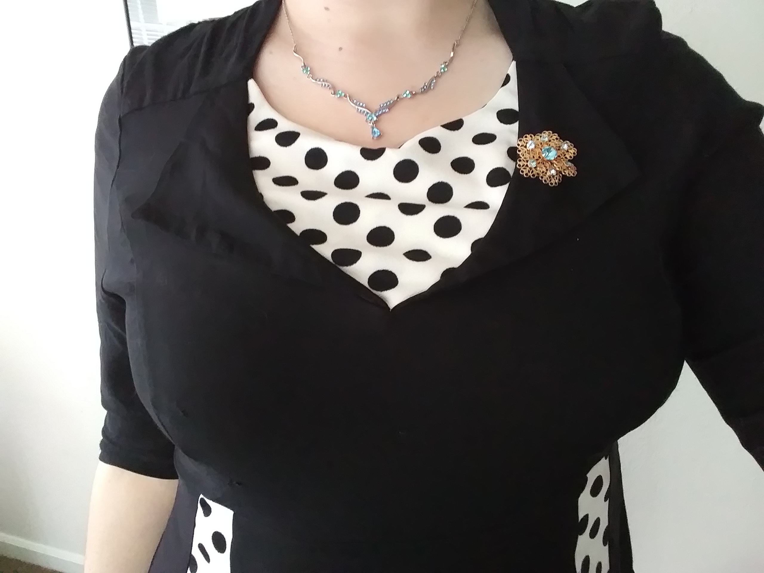 I tried so, so long to pretend to love this dress, I really did. Don’t get me wrong, I don’t hate it it’s just not vintage in anyway beside’s the silhouette. When I had originally purchased it the picture didn’t show any polka dots and was just a plain black, nothing else and that’s just not what I got. It has a very costume vibe to it, so much so I’ve even considered trying to dye the white to black.