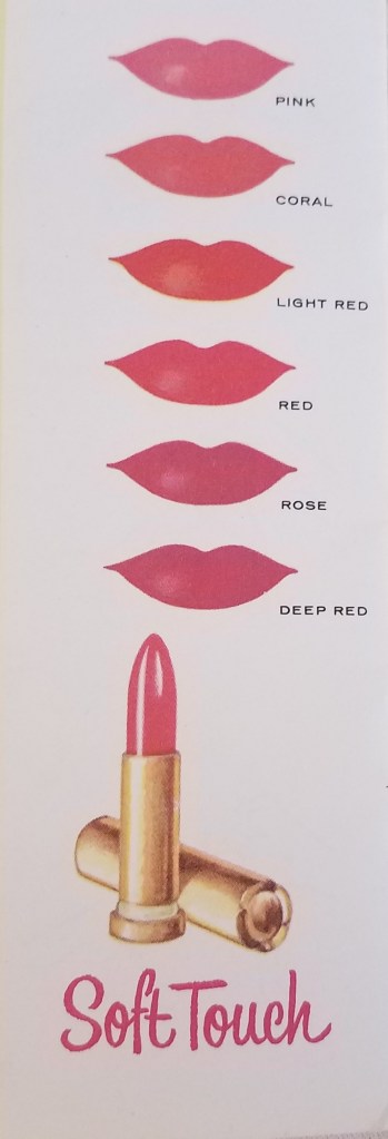 Now that our hair is perfected with evenly distributed oils, 100 strokes, and the perfect set lets move onto our makeup! We’ll start with lipstick as that’s one of the most telling signs of the decade’s face. Lipstick starts off with the boys and how it effects them. They say boys much prefer the look a brightly colored lips as opposed to sickly pale ones. Soft Touch is the lipstick of choice in this pamphlet, said to be a much higher quality that won’t slide off your face like others. In terms of application, you’re advised to use a soft hand and not over line unless your lips are very uneven. After fully coloring in your lips you’re to wait 20 minutes then lightly blot it. Now this may seem easy but before you go thinking you can just wear any old lipstick you need to know what color to pick! Luckily they have you covered there too.