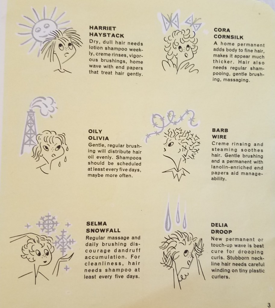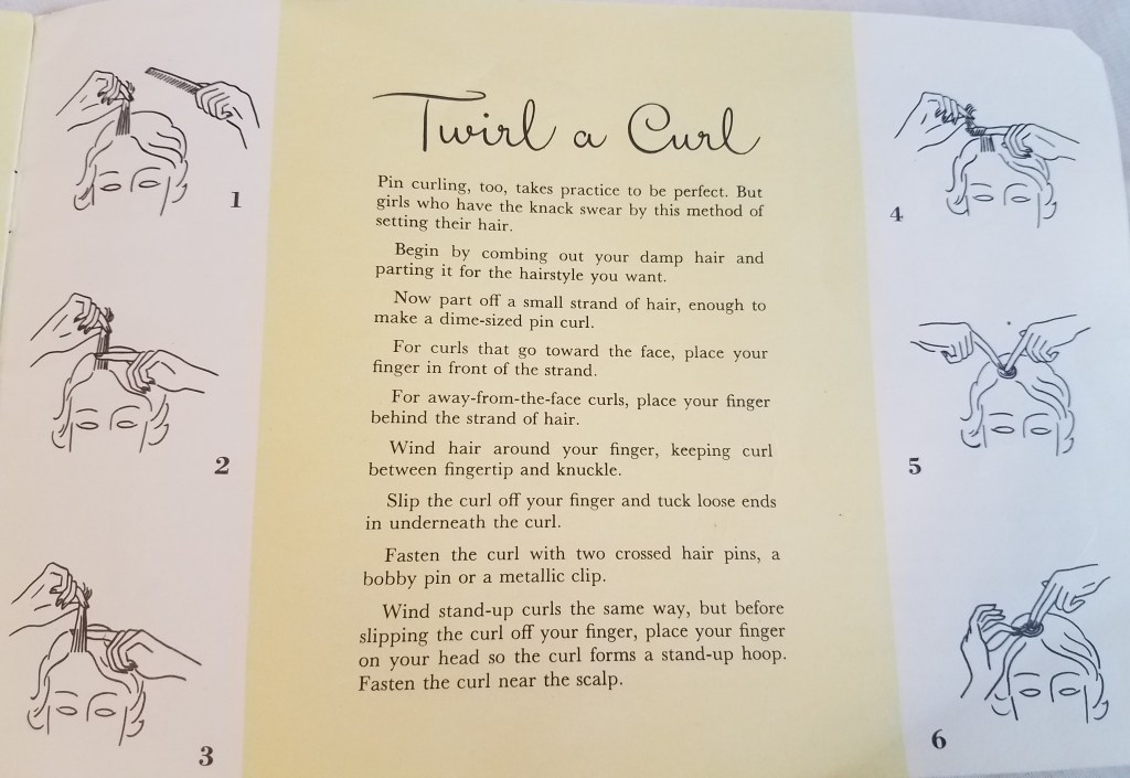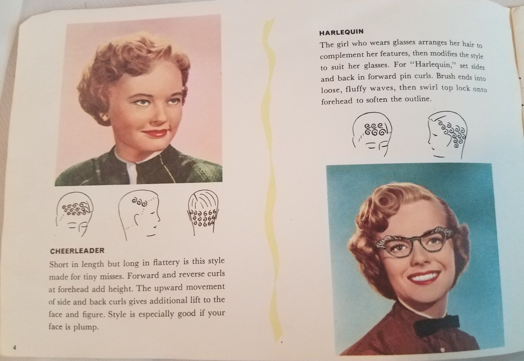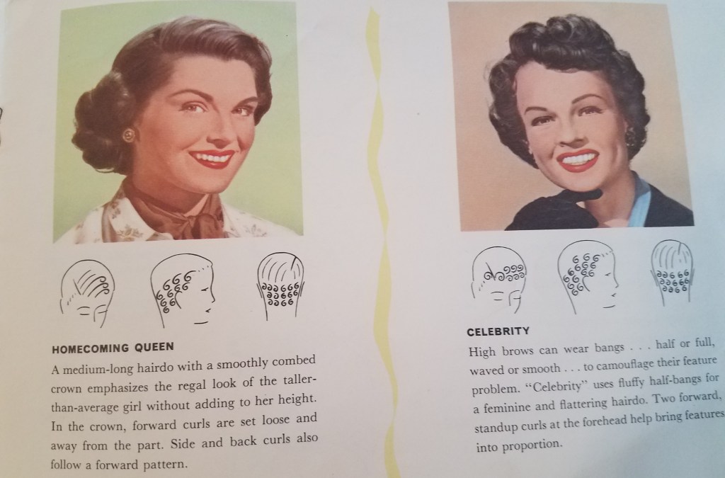 As we stand bent over brushing our hair, lets plan how we’ll style it! The book touches briefly on perms but is more so an advertisement for a certain brand of them and doesn’t actually tell much about the benefits or how to use them for styling. Luckily for us it does go into a little more depth with some setting patterns on the next two pages and also near the end!